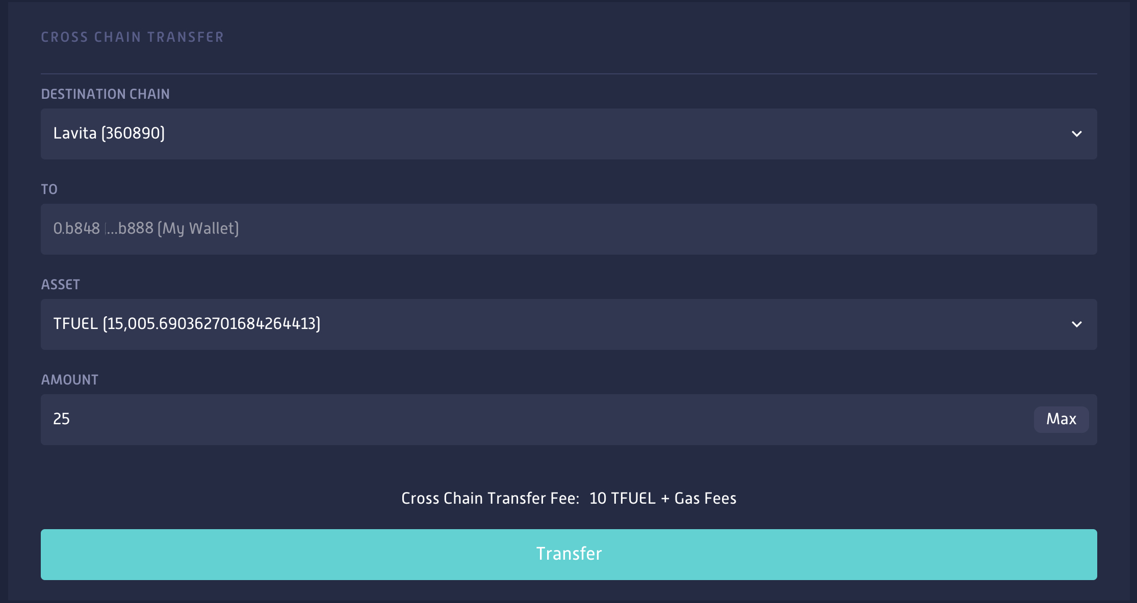 - Amount: At least 10 TFUEL (this is the gas fee to send Lavita from its chain to Theta Mainnet)